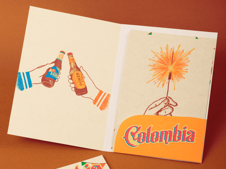 Este proyecto ilustrativo celebra el diciembre colombiano a través de íconos que han marcado generaciones: velitas encendidas, chispitas, buñuelos, sillas rimax en la calle, brindis con pola y el infaltable Niño Dios vestido de papá noel. A partir de un estilo nostálgico, hecho con trazos de lápiz de color sobre textura beige, cada pieza representa una escena que conecta con la cultura popular y el argot decembrino de nuestro país.